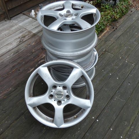 4 fælge i rimelig pæn stand. Dog ikke perfekte. Se bla. på billederne 2 mindre 'kantstenskys'.