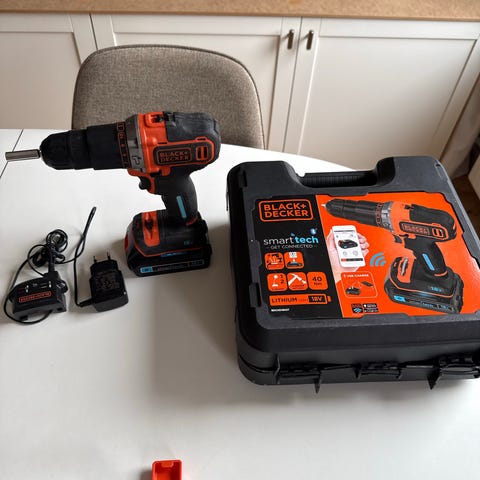 Black & Decker EPC12CA akku boremaskine 12V i rød/sort. Sættet inkluderer boremaskine, oplader, 10 v lithium-ion batteri og plastkuffert til opbevaring og transport. Velegnet til almindelige bore- og skrueopgaver i hjemmet og mindre gør-det-selv projekter.