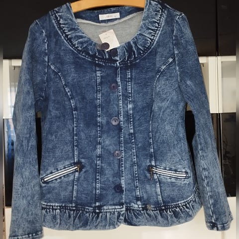 Jakken er lyse blå med en lysvasket effekt.