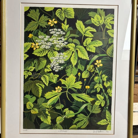 Sten Lykke Madsen 1981 indrammet grafisk tryk i sort-hvid. Motivet viser en komposition med flere figurer og interiørdetaljer udført i en stiliseret, grafisk streg. Trykket er signeret og dateret i nederste kant. Billedet er monteret med passepartout og indrammet i en enkel ramme, klar til ophængning på væg.