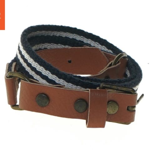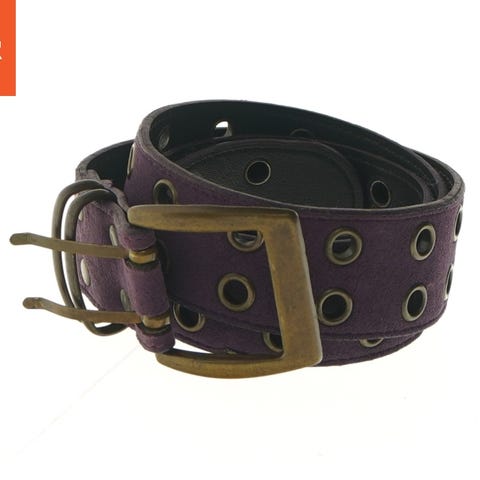 Bæltet er lavet af brunt læder og har et antikt-finish ovalt metalspænde. Der er dekorative messingfarvede knapper langs læderremmen. Bæltet er 100 cm langt og kan justeres efter behov.