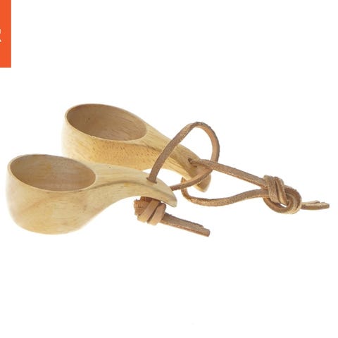 Et sæt af to æggebægre lavet af træ. De har en rund form med en diameter på 5 cm og er designet til at holde æg. Den naturlige træfarve giver dem et rustikt udseende.