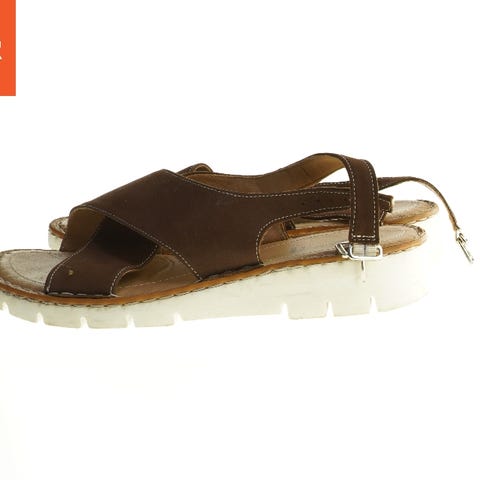 Par af sorte sandaler med plateau-sål i størrelse 41. Sandalerne har krydsstropper over foden og en ankelrem med spænde. Sølv har en brun underside med mønster for skridsikkerhed. Ideelle til sommerbrug og casual outfits.