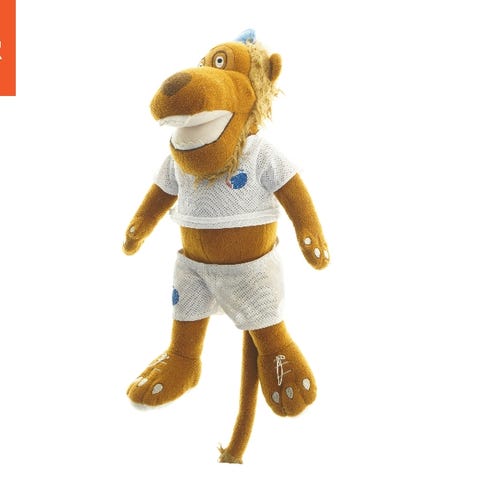 Dette plyslegetøj forestiller en figur, der bærer en rød nissehue med hvid kant og pompon. Den har en blå krop med teksten 'Stryhn's' på brystet. Legetøjet holder en blå gaffel i den ene hånd og et rødt skilt med et hvidt 'S' i den anden hånd. Størrelsen er 32 cm.