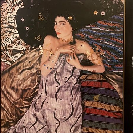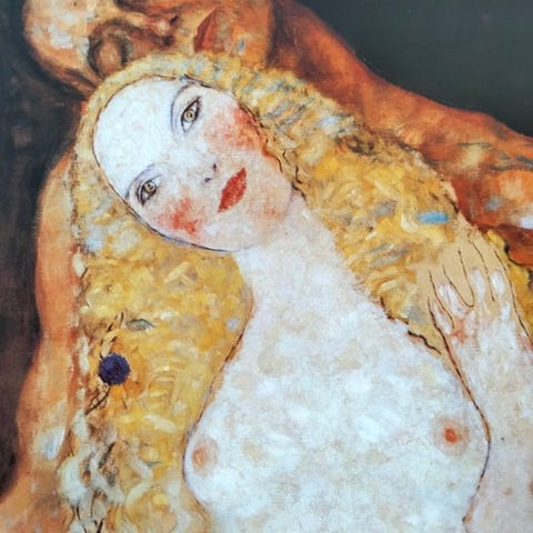 Det er et af Klimts berømte kvindebilleder, der er kendt for sin dekorative stil.