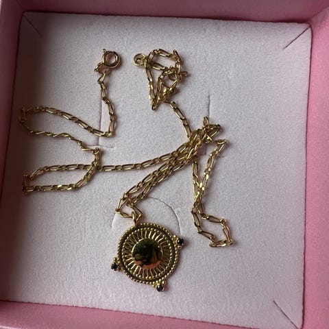 Halskæde, sølv, Maanesten, unik amulethalskæde. Den fine mønt, med solmotiv og små granulerede detaljer, er fattet med 3 små sorte diamanter.