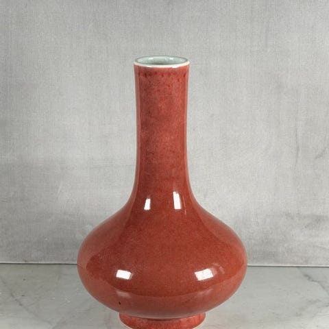 En porcelænsbaluster vase fra Kina, cirka midten af det 20. århundrede (1930'erne–1950'erne) med Qianlong-fire-tegn mærke i bunden, i rigtig god stand med få glasurfejl og små bagningsfejl, højde 28,2 cm, bredde 16 cm, dybde 16 cm. Klik på den blå "gå til varen" knap, for at købe eller byde på denne vare. Den samlede pris vil blive vist inden du afgiver dit bud.