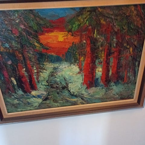 Landskabsmaleri udført som olie på lærred med motiv af åbent landskab og træer under blå himmel med skyer. Billedet er monteret i en klassisk, profileret træramme i gylden/brun nuance. Egnet til ophængning i stue, gang eller kontor som vægdekoration.