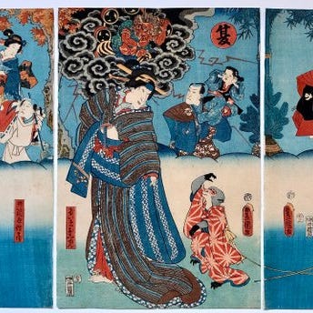 Tre ukiyo-e træsnit fra Edo-perioden med titlen Kabuki actors on stage, 1859, af Utagawa Kunisada, hver især trykt på washi-papir i størrelsen 36 × 24 cm, håndsigneret, generelt i god stand med noget baggrund og alderspletter. Klik på den blå "gå til varen" knap, for at købe eller byde på denne vare. Den samlede pris vil blive vist inden du afgiver dit bud.