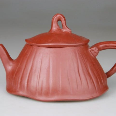 En fint potet Yixing-tekande i den spidsede Han Wa (汉瓦壶) form, udført i varm hongni (rød ler). Kroppen stiger op i en tilbageholdt, arkitektonisk silhuet, karakteristisk for sen Qing-skolens varer. Låget er forsynet med en Taiji (太極) topknop, som symboliserer balance, harmoni og de komplementære kræfter yin og yang inden for kinesisk kosmologi.