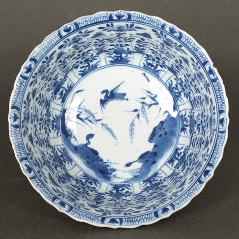 Porcelænsflad skål med lobbede kanter fra Jingdezhen i Kangxi-perioden (ca. 1700–1750), diameter 20 cm, højde 20 cm, underglaseret blå og hvid dekoration af Insect Hunting Birds, Geese and Ducks in Lotus Pond med bambus og vandplanter; fremragende stand med glaserede skader på bagsiden kun. Klik på den blå "gå til varen" knap, for at købe eller byde på denne vare. Den samlede pris vil blive vist inden du afgiver dit bud.