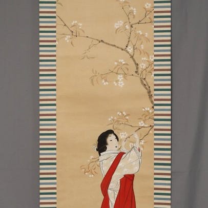 Beauty - Med signatur Shōzō 荘三, et japansk silke-maleri fra Shōwa-perioden af Ishikawa Shozo med japanske pigmenter på silke, 222 cm høj og 57,8 cm bred, enkeltstykke, originalt/officielt, monteret på silke med ruller i oksehovedben, vægt 1,25 kg. Klik på den blå "gå til varen" knap, for at købe eller byde på denne vare. Den samlede pris vil blive vist inden du afgiver dit bud.