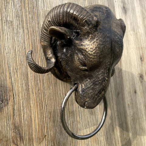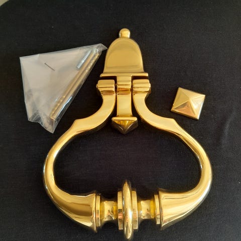 Dette er en ekstra stor dørklopper. Meget tungt af støbejern og flot gyldent kobberfarvet.