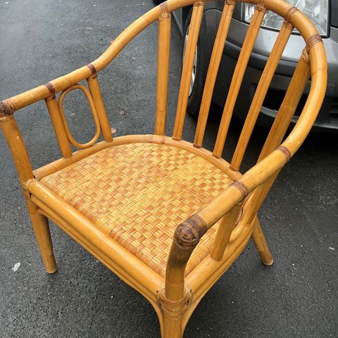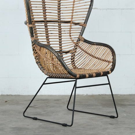 Denne vintage rotting/bambus håndflettede rottingramme i en varm honningbrun nuance, med krydsforbindelse under sædet for ekstra stabilitet og et luftigt, boheme-udtryk