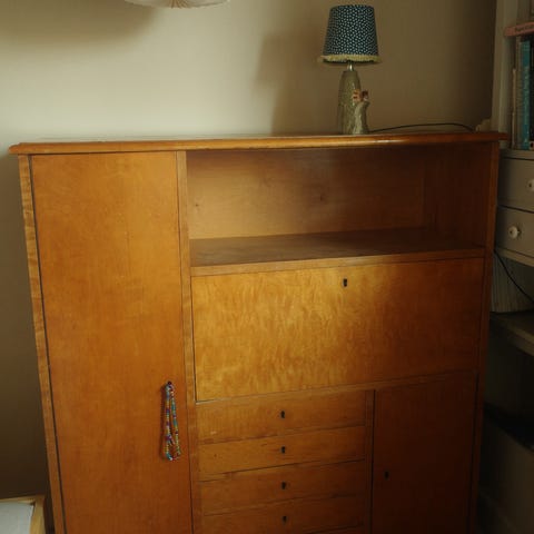 Fransk træskab fra 1950’erne–1960’erne i beige og hvid, 63 cm høj, 50 cm bred, 35 cm dyb, vejer 12 kg, én genstand, kan ikke låses, i god brugt stand med mindre aldersmærker og pletter, kan også bruges som natbord. Klik på den blå "gå til varen" knap, for at købe eller byde på denne vare. Den samlede pris vil blive vist inden du afgiver dit bud.