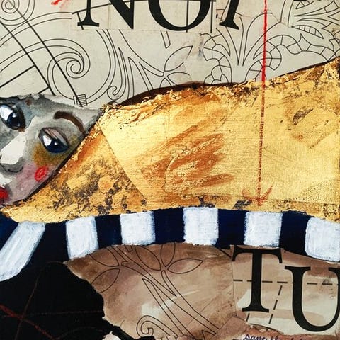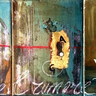 Teknik: Abstrakt composition i olie-, akryl- og aerosolmaleri med collage-indlæg