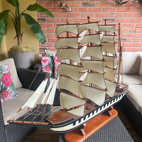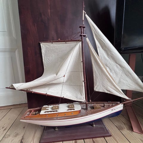 Authentic Models Sloop, en træmodel af sejlbat med planke-på-ramme konstruktion fra Holland, cirka 1970–1980, i meget god stand med naturlig patina, 110 cm høj, 110 cm bred og 17 cm dyb, ét styk, model Blue Green 1901, aurique sejl og baugspyd, reference ASA 050, monterings- og instruktionsvejledning medfølger, ingen original emballage, lille revne ved kølen og en talje der skal udskiftes. Klik på den blå "gå til varen" knap, for at købe eller byde på denne vare. Den samlede pris vil blive vist inden du afgiver dit bud.