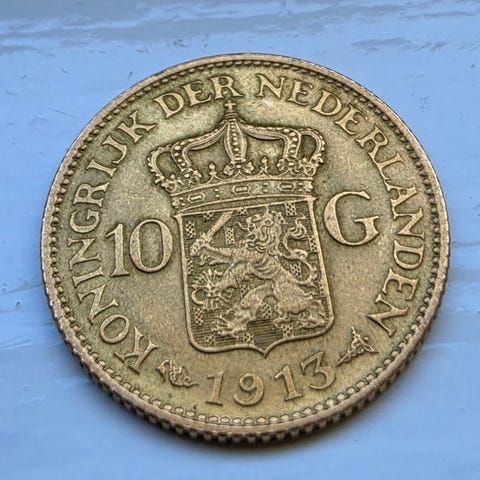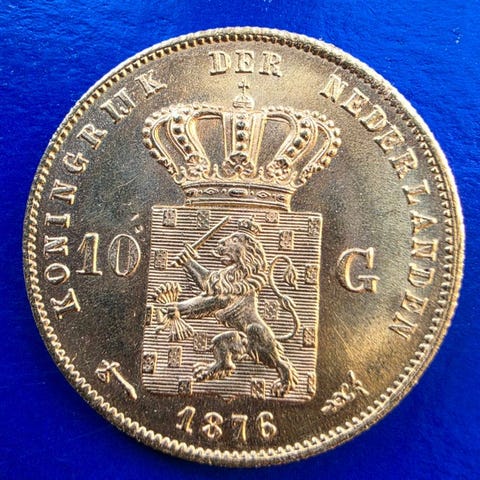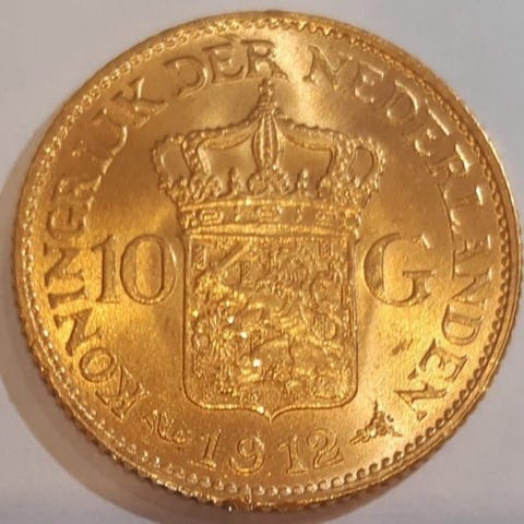 Hollandsk guldbelagt 10 gulden mønt fra 1926 med dronning Wilhelmina, vægt 7 g, ikke certificeret, verdensmønter før 2000. Klik på den blå "gå til varen" knap, for at købe eller byde på denne vare. Den samlede pris vil blive vist inden du afgiver dit bud.