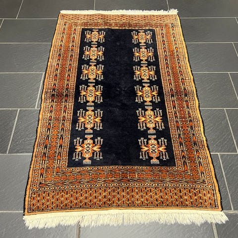 Vi præsenterer Dem et ekstraordinært, håndknyttede Buchara-orientteppe fra Pakistan – et sandt mesterværk inden for tæppekunsten.