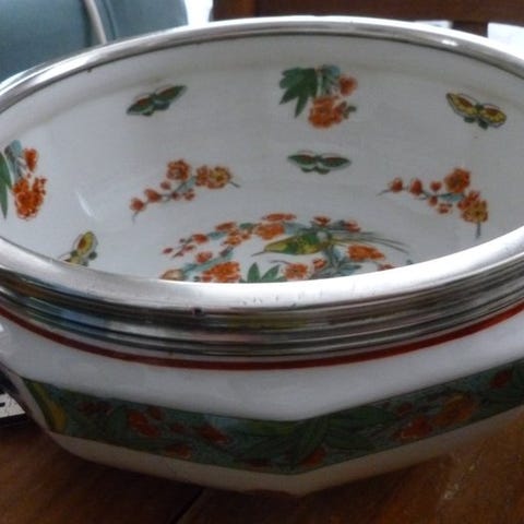 Genstanden er dekoreret med et elegant udlagt mønster af små farvede blomster (roser og blåklinter), typisk for Limoges-produktionerne fra denne periode.