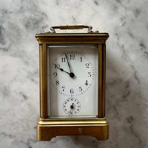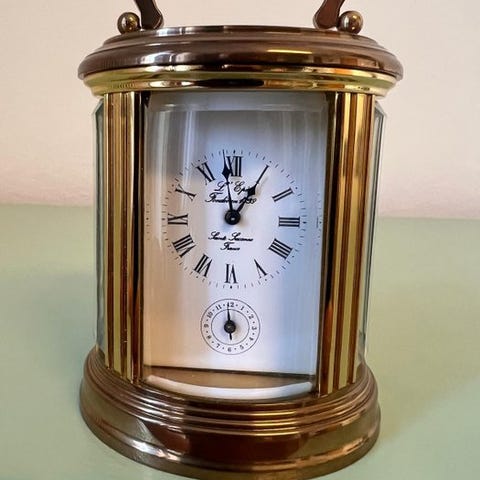 Antik Sonomatic messing bord-/rejseur med mekanisk 8-dages værk, kvarterstød på flere klokker og gonger, estimeret periode 1970–1980, lavet i Østrig, i god brugt stand; måler 10 × 10 × 3 cm, vægt 1000 g. Klik på den blå "gå til varen" knap, for at købe eller byde på denne vare. Den samlede pris vil blive vist inden du afgiver dit bud.