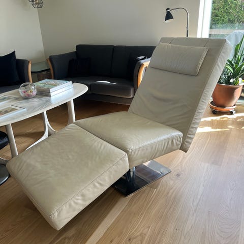 Chaiselong, patineret og dermed lidt slidt sort læder. Godt læsested /TV stol, sælges kun grund flytning