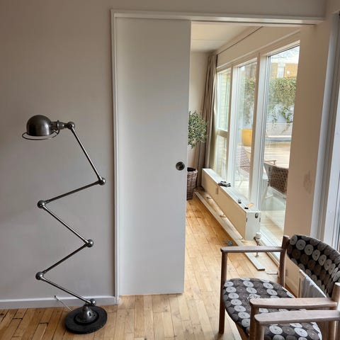 2 stk hvid skydedør med glat overflade og aluminiums-kant. Døren måler ca. 1964 x 766 mm ifølge mærkat dette er dog uden alukanterne. Egnet til brug som indvendig skydedør, f.eks. til garderobe, rumdeling eller skabsløsning. Der medfølger skinner som er ca 158 cm bred