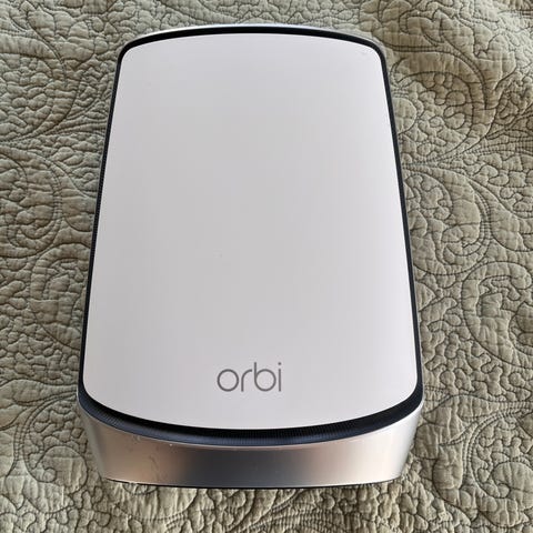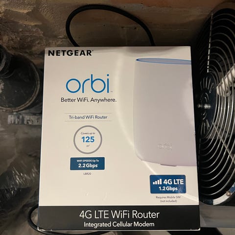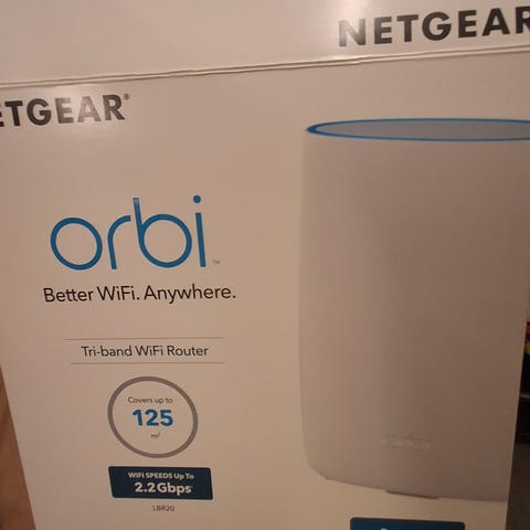 Netgear Orbi router i hvid. Trådløs router, som på billederne ses med strømforsyning. 4G. Der til tilkobles to antenner.