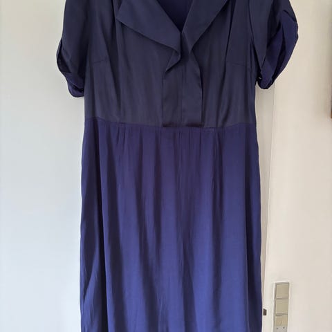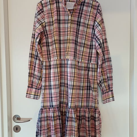Part Two hverdagskjole i lyserød/rosafarvet polyester og viskose i størrelse 42. Kjolen har rund halsudskæring, korte ærmer og lynlås i ryggen. Modellen er knælang med diskrete sidelommer og en enkel, lige pasform, der egner sig til hverdagsbrug. Ny pris kr 900,-.