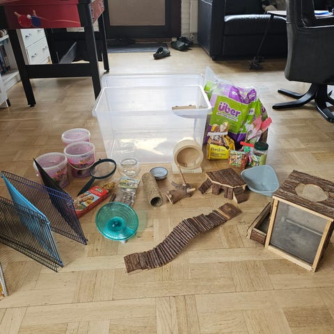 Bur til dværghamster med løbehjul, lille hus og madskål