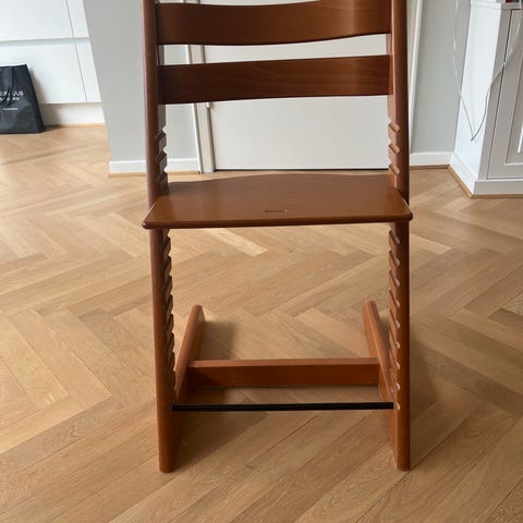 Stokke højstol i træ. Klassisk justerbar børnestol med fodplade og siddeplade, der kan tilpasses barnets højde. Egnet til brug ved spisebord eller som siddeplads til børn i hjemmet. Stolens konstruktion giver mulighed for lang tids brug i takt med at barnet vokser.