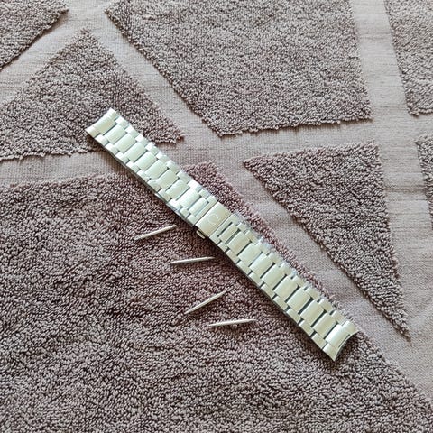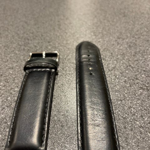 Original Omega gummirem. Remmen er sort med præget mønster og kontrastsyninger langs kanterne. Bredde ved horn er 22 mm (angivet på remmen). Undersiden er i gummi med bølgemønster og Omega-logo. Remmen har original foldespænde i metal med Omega-logo.
