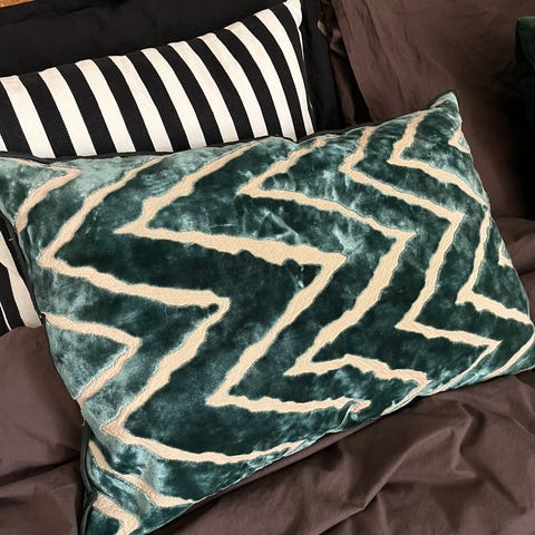 SUPER smuk aflang pude i grøn/blå/beige farve. Virkelig dekorativ.