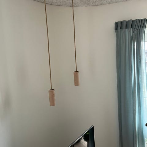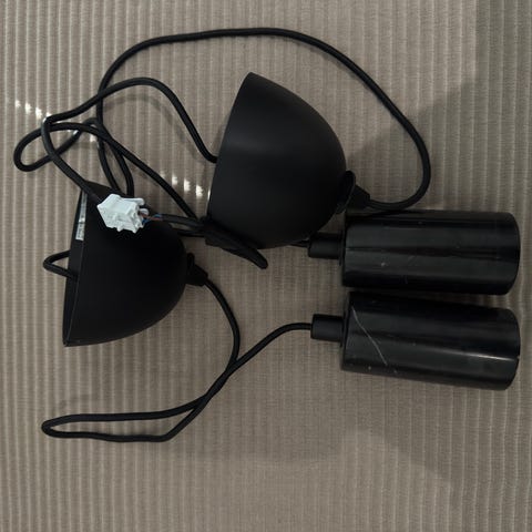 2 stk. nice kuglependel i mat sort med ophæng og pærer. Hvide inderskærme. Ø 17 cm H 14 cm. Lamperne har sorte stofledninger op til loftet på henholdsvis 57 cm og 74 cm. Fra ophæng er der 210 cm sort plast ledning. Samlet strømtilslutning. CE godkendt. Begge lamper virker fint og er hele og pæne.