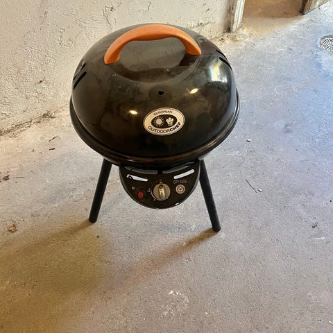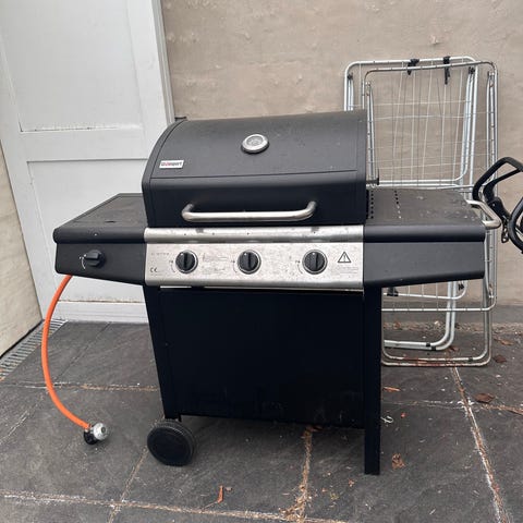 Gasgrill med flere brændere, sidebrænder og låg med indbygget termometer. Grillen har grillrist i metal (OBS hvor pladerne under risten skal tilkøbes og muligvis en rør hvor der kommer ild fra skal repareres, tre andre fungerer fint-derfor er prisen!)og opbevaringsskab med to låger under grillarealet.