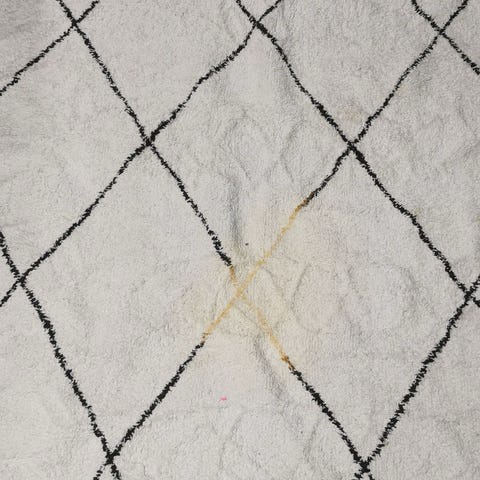 Ellos tæppe i naturfarvet tone med frynser i enderne. Tæppet har grov, vævet struktur og rektangulær form, egnet til brug i f.eks. stue, gang eller soveværelse på trægulv eller andre hårde overflader.