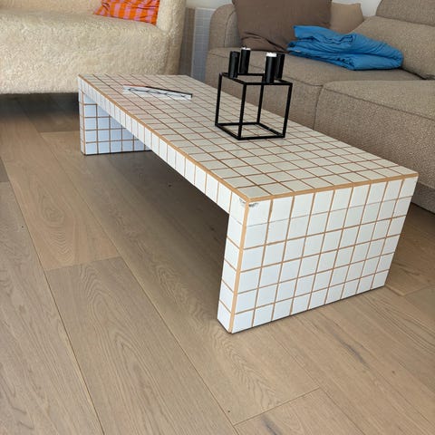 Sofabord med klinker/fliser sælges - der hører ekstra spartelmasse med, hvis ønskes. Bordet måler 123x46,5x31,5😄