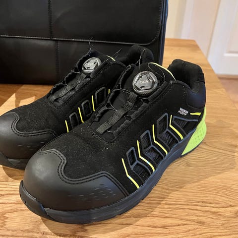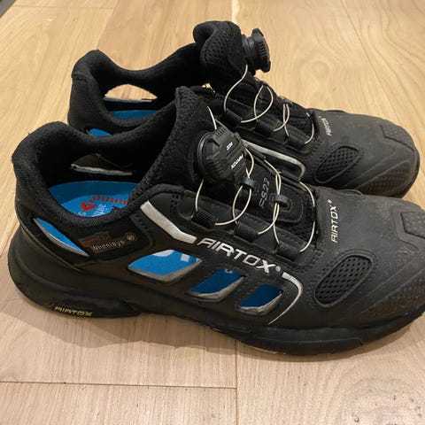 sneakers i sort, størrelse 42. Skoene har lukning med drejespænde/snøresystem foran og overdel i mesh og syntetisk materiale. Ydersålen er mønstret gummi med forstærkning ved tå og hæl. Modellen er egnet som arbejdssko eller fritidssko og giver støtte omkring hælen med polstret kant og trækstrop bagpå for nem påtagning.