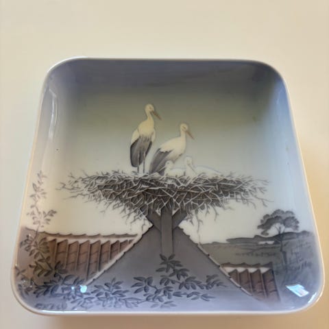 Bing & Grøndahl kvadratisk porcelænsfad med dekoreret landskabsmotiv i afdæmpede farver. Fadet er udført i porcelæn og har let afrundede hjørner. Undersiden er stemplet med Bing & Grøndahl-mærke og formnummer. Velegnet som lille serveringsfad eller dekorativt fad til udstilling.