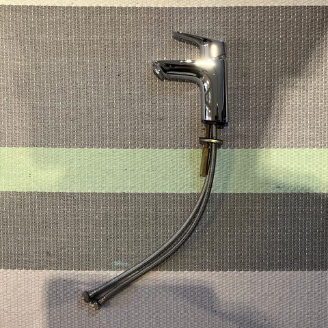 Blandingsbatteri til håndvask i kromfarvet metal. Modellen har et enkelt greb til regulering af vandtemperatur og -mængde. Leveres med tilslutningsslanger som vist på billederne. Velegnet til montering på badeværelsesvask eller lignende installation, hvor der ønskes et krom armatur med enkelt betjening.