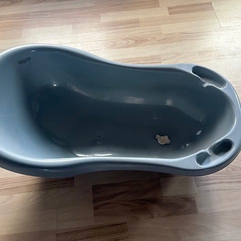 Sammenklappeligt babybadekar i plast i hvid og grå. Badekarret har en rektangulær form med let forhøjet liggeflade og skridsikre knopper i bunden. Det kan foldes sammen, så det fylder minimalt ved opbevaring. Velegnet til badning af spædbørn og mindre børn i hjemmet eller på rejser.