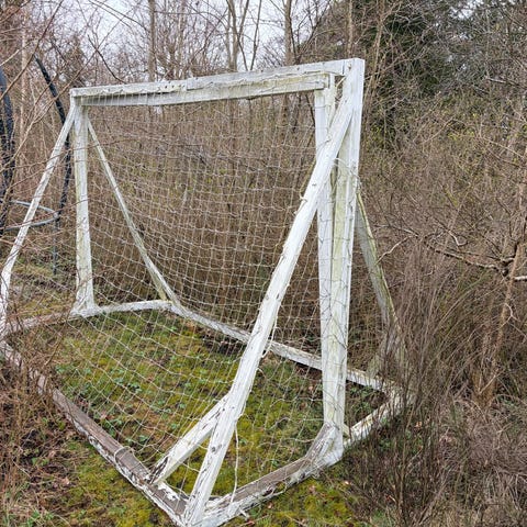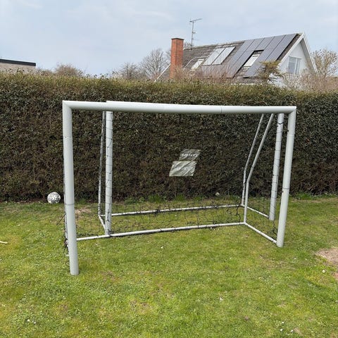 To styk fodboldmål i sortmalet træ. De er brugte, men holder stadigvæk i flere år.