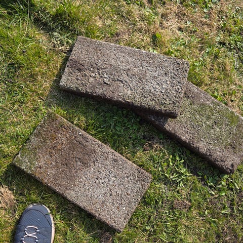 Fliser i forskellige størrelser. Du tungeste er gravet op. Derudover må du endelig grave flere op. Der er til cirka 6x5 meter.