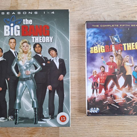 The Big Bang Theory dvd samling med sæson 1, 2, 3, 4 og 5. Hver sæson er i separat dvd-boks med originalt omslag. Tv-serie i komedie-genren på fysisk dvd-medie, egnet til afspilning på dvd-afspillere der understøtter de viste aldersmærkninger og regioner på omslagene.