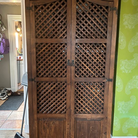 Solidt skab 180x107x40. Kan også bruges som åben reol hvis dørene tages af. Et par af listerne i lågen sidder løst og en mangler (ses på billedet).