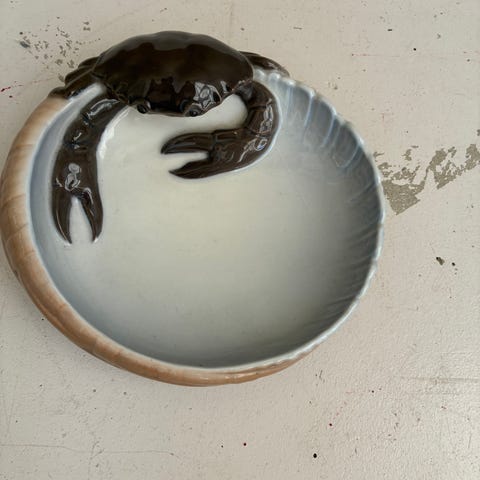 Aluminia skål med krabbe i porcelæn. Skålen er dekoreret med en relief-krabbe langs kanten og har en glaseret overflade i nuancer af blå og hvid. Egnet som serveringsskål eller dekorationsgenstand. Bundstempel og nummerering fremgår under bunden.