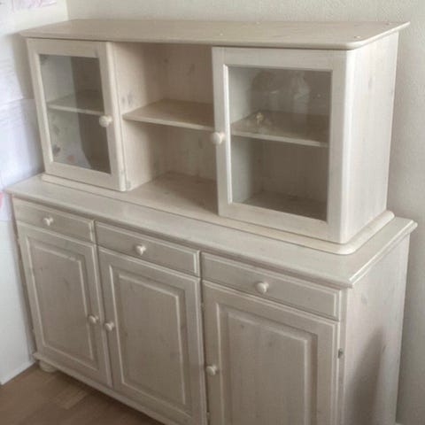 Skænk i fyrretræ sælges. Ligner et ældre ikeamøbel, men der står ikke ikea nogen steder. Møblet er lidt slidt med pletter men fungerer fint - skuffen kører fint ud og ind.. Ville blive flot med maling. Kan hentes i Nykøbing Sj efter aftale.