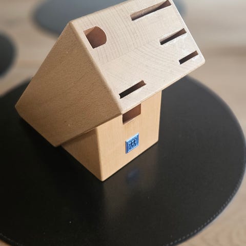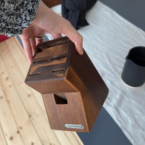 Wooden knife holder. Fits 5 knives + 2 utensils (scissors etc.). In good shape, minor signs of use. Can be picked up in Christianshavn/ Amager, Copenhagen.