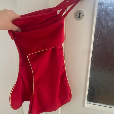 Jysk Tjalfe julestrømpe 50 cm i rød farve med gråt kantstykke og påsyet nissemotiv med skæg og ternet hue på forsiden. Julestrømpen er mærket som "Christmas Stocking Tjalfe" og er velegnet til ophængning i hjemmet i julen til små gaver eller dekoration. Materialet fremstår som blødt tekstil. Egnet til indendørs brug i julesæsonen.