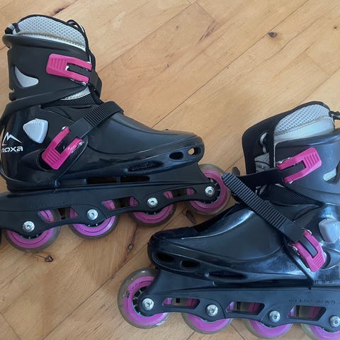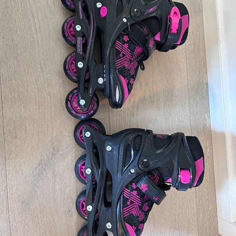 Inliners rulleskøjter i børnestørrelse 37. Rulleskøjterne er sort/pink med justerbare spænder og snørelukning. De har hårdt skaft for støtte om anklen og hjul monteret på skinne. Velegnet til børn eller unge, der ønsker rulleskøjter til fritidsbrug på jævne underlag.